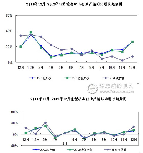 2012年1-12月份,全國重型礦山機(jī)械行業(yè)的發(fā)展形勢有所回升,工業(yè)總產(chǎn)值和銷售產(chǎn)值同比增速明顯上升,環(huán)比增速平緩,出口交貨值同、環(huán)比增速均有所回升。