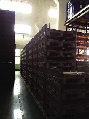 由廢塑料“演變”而來的塑料托盤在倉庫里整齊排列。
