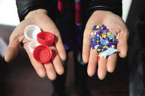 粉碎機粉碎。圖為飲料瓶蓋經(jīng)粉碎后,變成顏色各異的塑料薄片。