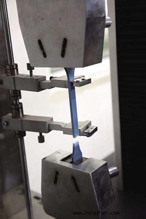 再生塑料樣板需要接受拉伸試驗,圖為被拉斷的瞬間。