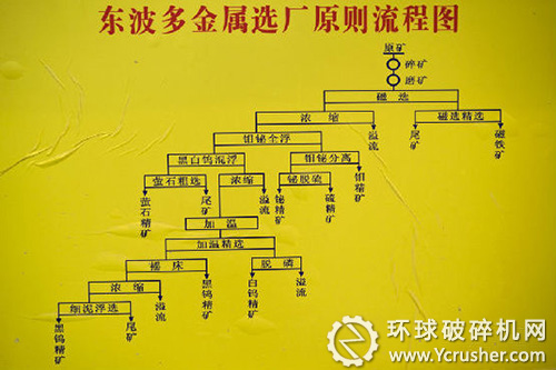 本廠給礦品位為鉬0.074%、鉍0.076%、鎢0.16%、螢石19%,經(jīng)加工選別后每年可得到品味達(dá)45%的鉬精礦1100噸、品味達(dá)24%的鉍精礦1600噸、品味達(dá)65%的白鎢精礦1500噸、品味達(dá)30%的黑鎢精礦1300噸、品味達(dá)95%的高品位螢石精礦5.74萬噸、品味達(dá)85%低品位螢石精礦3.76萬噸,鉬、鉍、鎢、螢石的回收率分別為72%、55%、60%、45%,同時(shí)綜合回收磁鐵鐵礦、硫精礦等副廠品。