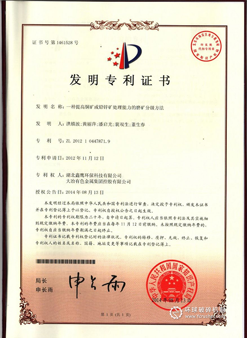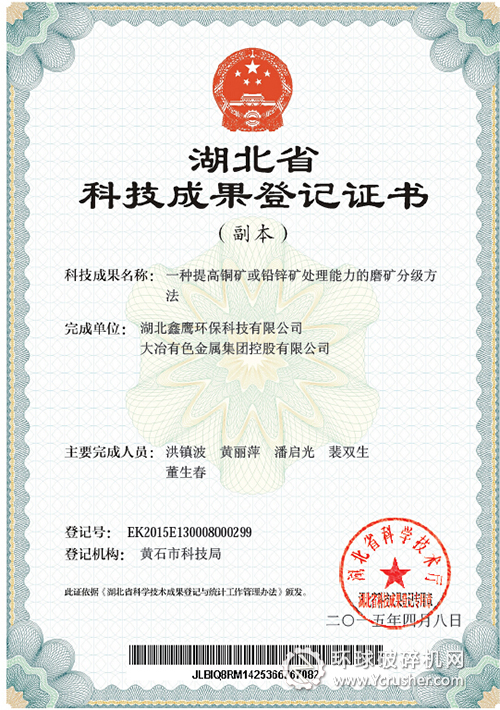 技術(shù)創(chuàng)新促進(jìn)企業(yè)發(fā)展。2015年4月8日,鑫鷹科技一種提高銅礦或鉛鋅礦處理能力的磨礦分級方法,榮獲湖北省科學(xué)技術(shù)成果登記證書,在公司的榮譽(yù)墻上又增添了新的一筆。