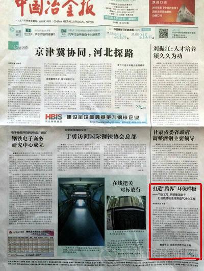 5月23日,《中國冶金報(bào)》在頭版刊登了題為《打造“跨界”環(huán)保樣板——中冶北方、永鋼集團(tuán)聯(lián)手打造燒結(jié)機(jī)活性焦煙氣凈化工程》的文章,文章以項(xiàng)目投運(yùn)為契機(jī),深度報(bào)道了該項(xiàng)目應(yīng)用的活性焦煙氣凈化技術(shù),介紹了項(xiàng)目管理中關(guān)于成本、質(zhì)量和安全的經(jīng)驗(yàn)以及項(xiàng)目所取得的經(jīng)濟(jì)效益、環(huán)境效益。該項(xiàng)目是國內(nèi)建設(shè)的第一套具有完全自主知識產(chǎn)權(quán)、設(shè)備全部國產(chǎn)化的燒結(jié)煙氣活性焦凈化裝置,該系統(tǒng)首次將高效率、低成本的活性焦(炭)煙氣治理技術(shù)引入鋼鐵行業(yè)。