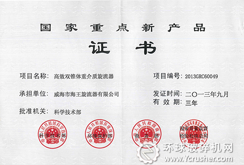 海王高效雙錐體重介質(zhì)旋流器被評為“國家重點新產(chǎn)品”。