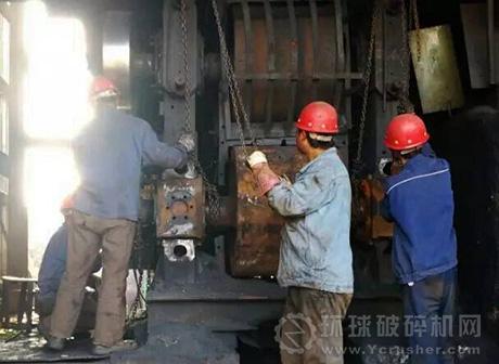 工人手拉吊鏈對(duì)重達(dá)1噸的四輥破碎機(jī)機(jī)輥依次進(jìn)行更換