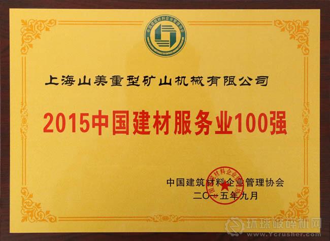 2015年9月中旬,在由中國建筑材料企業管理協會組織召開的“2015中國建材企業發展論壇暨2015中國建材企業500強、建材服務業100強、民營建材企業100強、最具成長性建材企業100強發布會”上,上海山美獲2015中國建材服務業100強,裝備供應商全國十強殊榮。