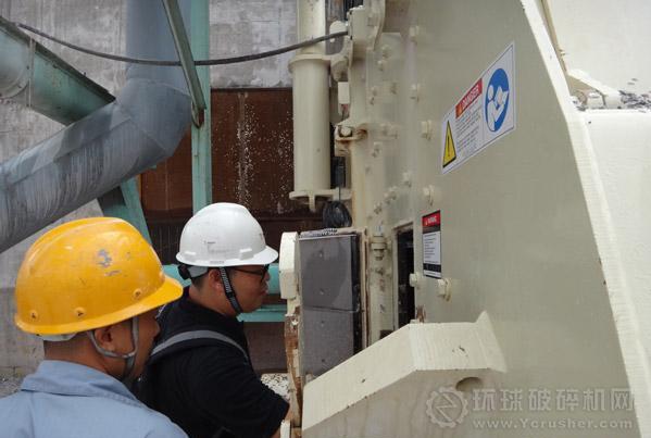 美卓現(xiàn)場服務工程師與興安海螺骨料生產(chǎn)線班長通過安全門檢查板錘磨損情況。