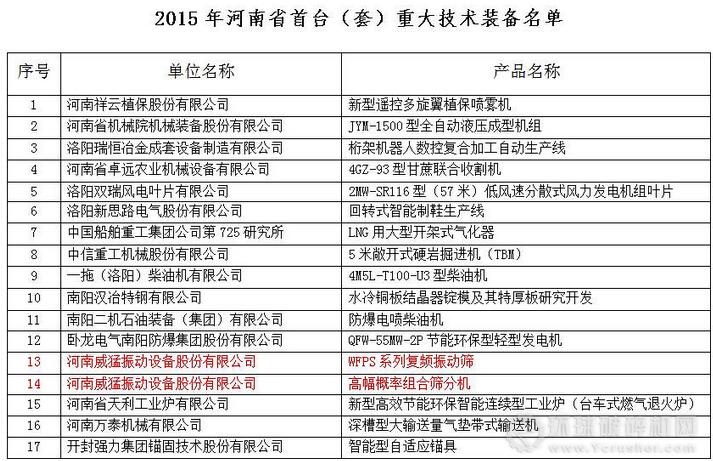 近日,2015年河南省首臺(套)重大技術裝備認定產(chǎn)品名單出爐,全省共有29家企業(yè)的產(chǎn)品被認定。其中,河南威猛振動兩項科技產(chǎn)品“WFPS系列復頻振動篩”和“高幅概率組合篩分機”通過河南省“首臺(套)重大技術裝備”認定。