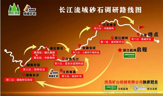 礦山機(jī)械有限公司獨(dú)家冠名、中國(guó)砂石骨料網(wǎng)全案策劃的“骨料?中國(guó)——長(zhǎng)江流域砂石調(diào)研”圓滿完成。本活動(dòng)歷時(shí)8天,從浙江出發(fā),直奔湖南,隨后沿湖北、江西、安徽、江蘇等地,一路考察至上海,調(diào)研團(tuán)隊(duì)跨越3500余公里,走訪十余家企業(yè),是迄今為止砂石骨料行業(yè)最大規(guī)模的一次調(diào)研活動(dòng)。