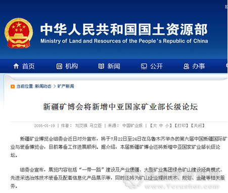 1月19日,國土資源部刊登新聞《新疆礦博會將新增中亞國家礦業部長級論壇》。新疆維吾爾自治區人民政府主辦的新疆礦業博覽會將于2016年增加中亞國家礦業部長級論壇,即“中國-亞歐礦業部長級論壇”。