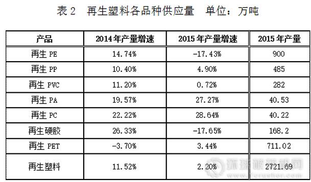 2015年再生塑料供應量明顯放緩(見表2)。在統計的7個再生品種中,供應量萎縮的產品有2個,其中以再生PE為代表,供應量減少150萬噸;再生硬膠也減少30萬噸,降幅達到17.65%。其他再生料供應增速都有所減少,幾乎與2014年供應量持平。據調研,2015年再生塑料的整體供應量達到2721萬噸,其中再生通用料的供應量達到1900萬噸,較2014年減少近160萬噸。目前再生塑料行業面臨環保壓力,各省市正在嚴抓環境質量,另外由于國際經濟形式不容樂觀,預計2016年再生通用料的供應量將繼續減少。