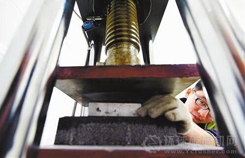檢驗室的工作人員正在對用建筑棄料制作的透水磚進(jìn)行抗壓測試。