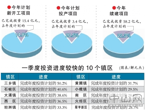 從鎮區完成情況看,第一季度投資進度較快的10個鎮區分別為三鄉鎮、石岐區、大涌鎮、西區、坦洲鎮、黃圃鎮、小欖鎮、南區、火炬區、翠亨新區等10個鎮區,分別完成年度投資計劃的50.2%、40.6% 、38.6% 、36.5% 、33.3% 、31.7% 、29.5%、28.8%、27.8%、25.7%。其中,翠亨新區、石岐區、小欖鎮完成投資體量較大,分別完成11.9億元、8.2億元、4.7億元。