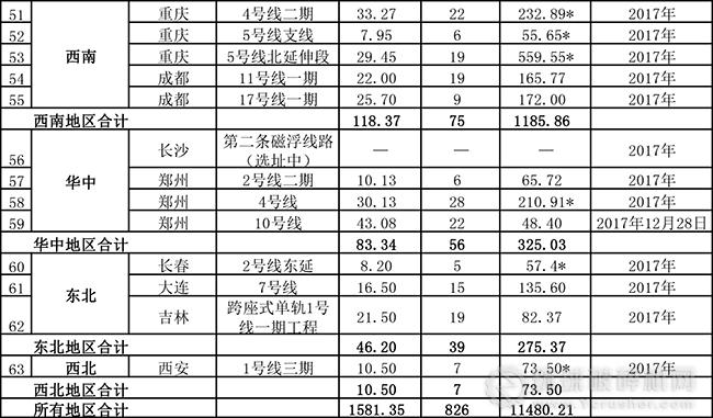 表1 2017年中國城市軌道交通新增開工線路(按區(qū)域劃分)