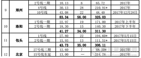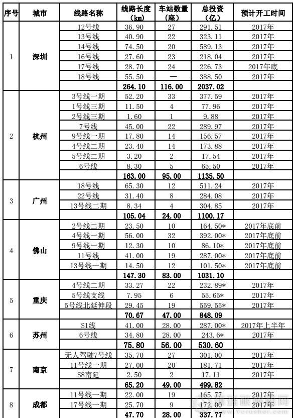 據(jù)不完全數(shù)據(jù)統(tǒng)計顯示,2017年,中國有北京、廣州、深圳、佛山、中山、南京、蘇州、青島、杭州、無錫、合肥、福州、寧波、常州、蕪湖、南通、紹興、天津、太原、呼和浩特、包頭、洛陽、重慶、成都、長沙、鄭州、長春、大連、吉林、西安30座城市軌道交通新增63條即將開工線路,合計里程為1581.35公里,車站826座,總投資額為11480.21億元。