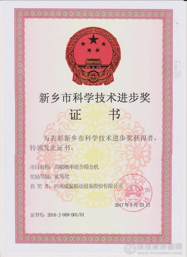 威猛振動(dòng)新一代技改升級產(chǎn)品高幅概率組合篩分機(jī)于2017年2月23日獲新鄉(xiāng)市人民政府頒發(fā)“新鄉(xiāng)市科學(xué)技術(shù)進(jìn)步獎(jiǎng)貳等獎(jiǎng)”證書。