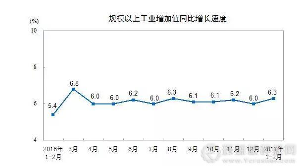 2017年1-2月份,規(guī)模以上工業(yè)增加值同比實(shí)際增長(zhǎng)6.3 %(下同,增加值增速均為扣除價(jià)格因素的實(shí)際增長(zhǎng)率),較2016年12月份加快0.3個(gè)百分點(diǎn);從環(huán)比看,2月份,規(guī)模以上工業(yè)增加值比上月增長(zhǎng)0.60%。