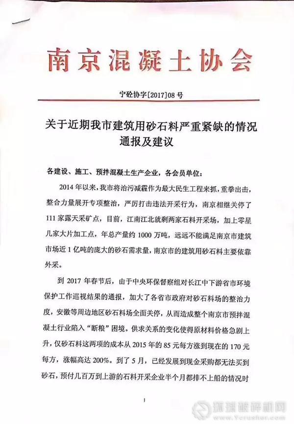 據(jù)了解,2017年5月26日,南京混凝土協(xié)會(huì)發(fā)布《關(guān)于近期我市建筑用砂石料嚴(yán)重緊缺的情況通報(bào)及建議》文件,文件介紹:南京江南江北僅剩兩家石料開(kāi)采場(chǎng),加上零星幾家大片加工點(diǎn),南京市砂石料年產(chǎn)總量約1000萬(wàn)噸,遠(yuǎn)遠(yuǎn)不能滿(mǎn)足南京建筑市場(chǎng)近1億噸的龐大的砂石需求量,南京市的建筑用砂石料主要依靠外采。