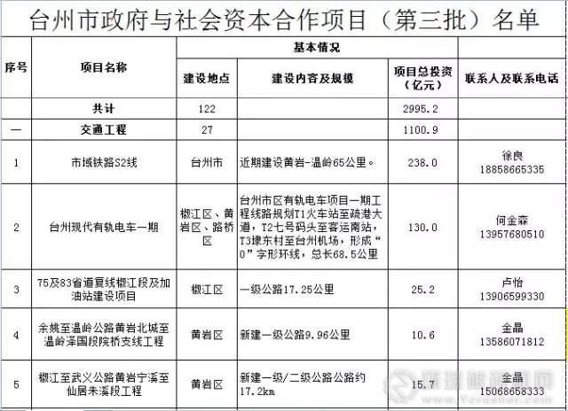 日前,浙江臺州市政府與社會資本合作(PPP)項(xiàng)目推介表已經(jīng)公布。此次發(fā)布的臺州市第三批PPP項(xiàng)目,共包括122個項(xiàng)目,涉及交通、市政、公共服務(wù)、農(nóng)業(yè)水利、區(qū)塊開發(fā)等5大領(lǐng)域,共涉及投資2990多億元。其中包括污水處理、環(huán)境治理等環(huán)保項(xiàng)目。詳情如下: