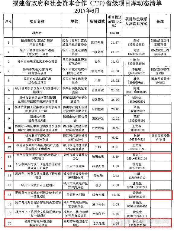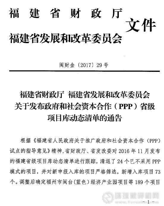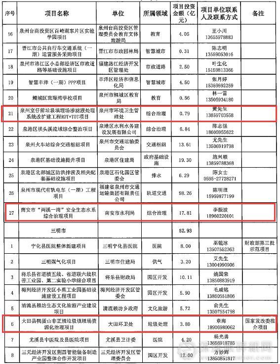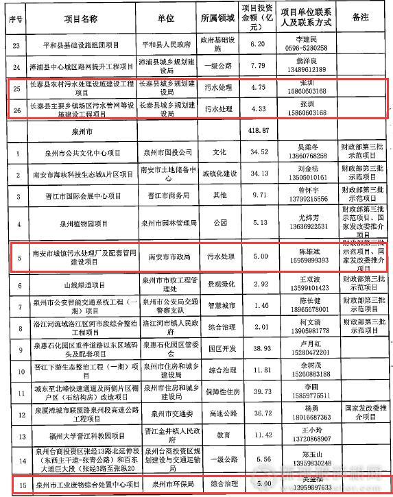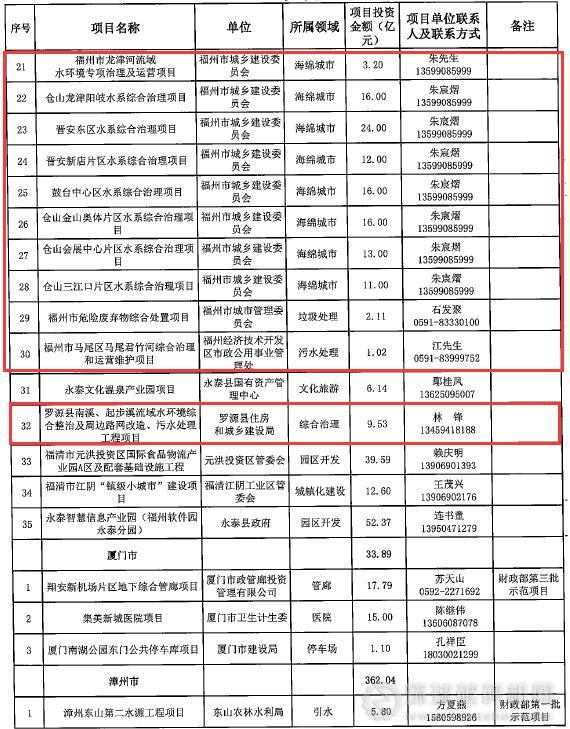 日前,福建省財政廳聯(lián)合省發(fā)改委發(fā)布最新版的政府和社會資本合作(PPP)省級項目庫動態(tài)清單,189個項目入選,項目總投資2870.38億元。其中,福州35個,廈門3個,漳州26個,泉州27個,三明8個,莆田10個,南平23個,龍巖23個,寧德20個,平潭綜合實驗區(qū)7個,省直7個。福建PPP項目涉及環(huán)境治理、污水處理、垃圾焚燒等環(huán)保項目。
