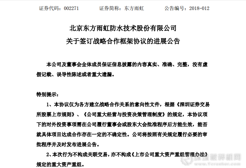 2017年11月26日,北京東方雨虹防水技術(shù)股份有限公司與來(lái)賓市人民政府簽訂了《戰(zhàn)略合作框架協(xié)議》,協(xié)議約定公司擬在來(lái)賓市投資建設(shè)特種砂漿、防水卷材、防水涂料、碳酸鈣礦、石英礦等項(xiàng)目。