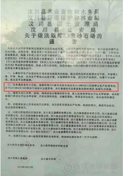 四川省汶川縣相關(guān)部門要求,3月31日之前23家非法砂石廠停止經(jīng)營活動,并于4月15日前拆除非法建筑物,自行清理相關(guān)設(shè)施和原料物資,實(shí)施生態(tài)恢復(fù),并在6月底前取締第三批10家砂場!