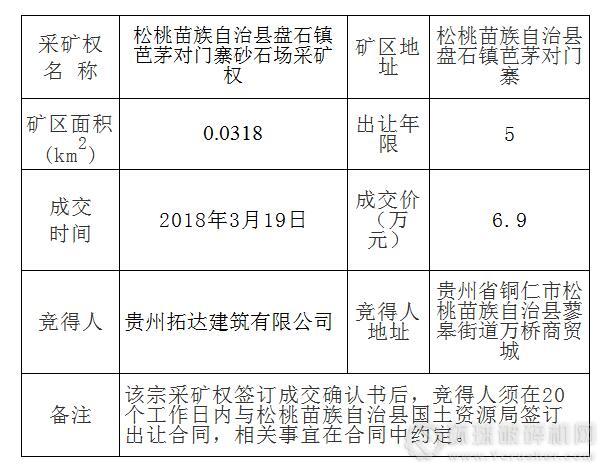 根據(jù)市場需要,按照《中華人民共和國礦產(chǎn)資源法》、《礦產(chǎn)資源開采登記管理辦法》、國土資源部《關(guān)于印發(fā)〈探礦權(quán)采礦權(quán)招標(biāo)拍賣掛牌管理辦法(試行)〉的通知》等文件精神,銅仁市公共資源交易中心松桃分中心受松桃苗族自治縣國土資源局委托,于 2018年 3 月 5 日至 2018 年 3 月 16 日 17 時時。在銅仁市公共資源交易中心松桃分中心掛牌出讓成交1宗采礦權(quán)(松礦交易告字〔2018〕4號),現(xiàn)將交易結(jié)果公示如下: