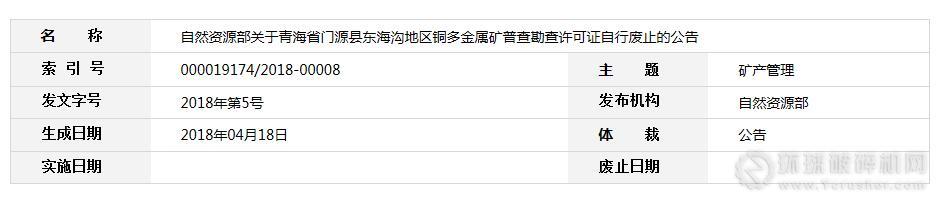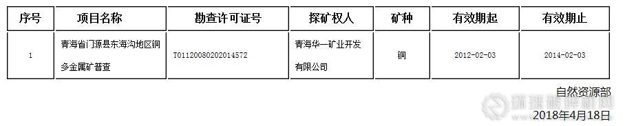 根據《礦產資源勘查區塊登記管理辦法》(國務院令第240號)第十條和《國土資源部關于進一步規范礦產資源勘查審批登記管理的通知》(國土資規〔2017〕14號)的有關規定,經核實,青海省門源縣東海溝地區銅多金屬礦普查項目在勘查許可證有效期屆滿前未依法辦理延續登記申請手續,勘查許可證自有效期屆滿之日起已經自行廢止,現予以公告。勘查許可證基本信息如下: