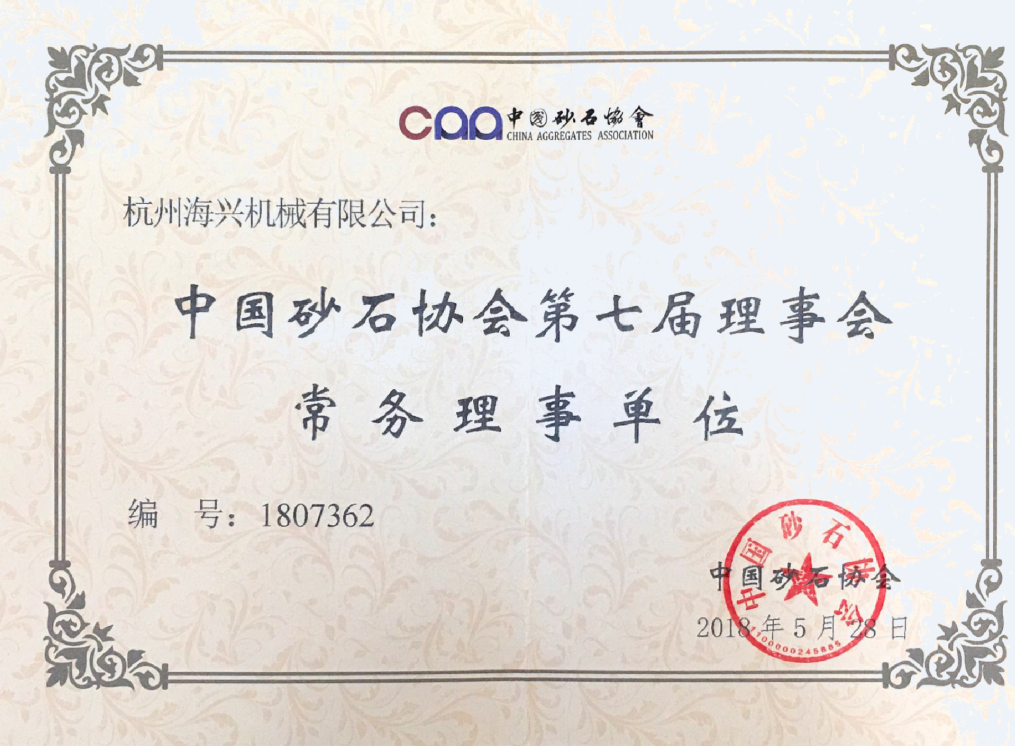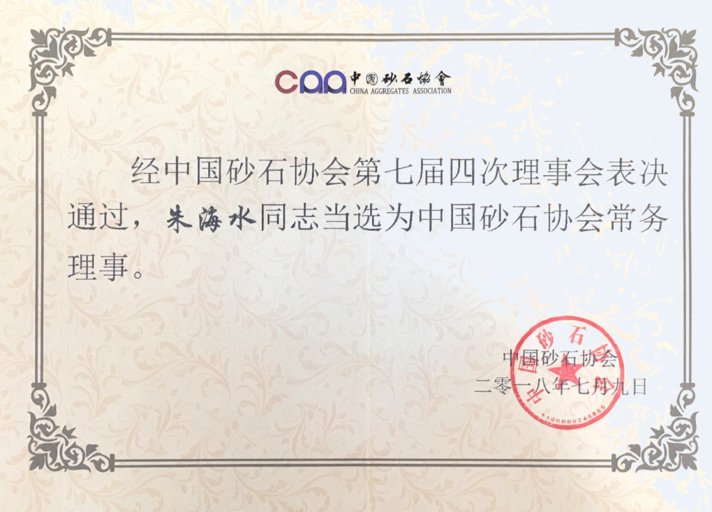 中國砂石協(xié)會(huì)第七屆四次理事會(huì)表決通過,杭州海興機(jī)械有限公司董事長朱海水當(dāng)選中國砂石協(xié)會(huì)常務(wù)理事并頒發(fā)證書。
