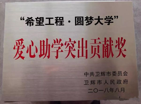2018年8月29日,衛(wèi)輝市舉辦了第十二屆“希望工程·圓夢大學”助力脫貧活動表彰大會暨助學金發(fā)放儀式,對在助力脫貧活動中表現(xiàn)突出的單位授予榮譽稱號。中譽鼎力智能裝備有限公司被授予“愛心助學突出貢獻獎”榮譽。