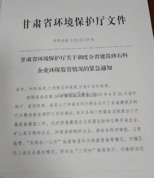 9月27日,甘肅省環(huán)境保護(hù)廳下發(fā)緊急通知,要求調(diào)度全省建筑砂石料企業(yè)環(huán)保監(jiān)管情況。