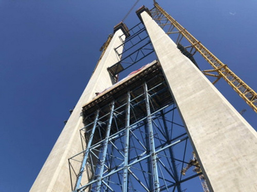 此次封頂?shù)闹魉榇髽蛉A坪岸左幅塔柱,塔高228米(含塔冠),為鋼筋混凝土門式框架結(jié)構(gòu),塔頂距金沙江江面垂直高度479米,接近160層樓的高度。自2018年2月澆筑首節(jié)主塔混凝土以來(lái),150名建設(shè)者克服了交通條件差、氣候條件多變、玄武巖機(jī)制砂混凝土高泵送難等諸多困難,歷時(shí)200余天。下一步,大橋?qū)⑷孓D(zhuǎn)入上部結(jié)構(gòu)施工,實(shí)施工序轉(zhuǎn)換。