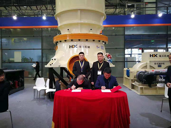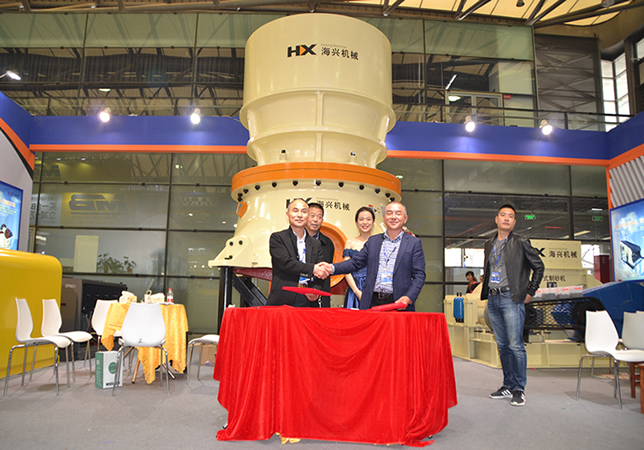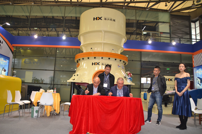 上海寶馬工程機械展第二天,下午兩點,杭州海興機械有限公司與廣西新東運礦業(yè)有限公司日產(chǎn)六萬噸骨料生產(chǎn)線簽約儀式在杭州海興有限公司展位隆重舉行!