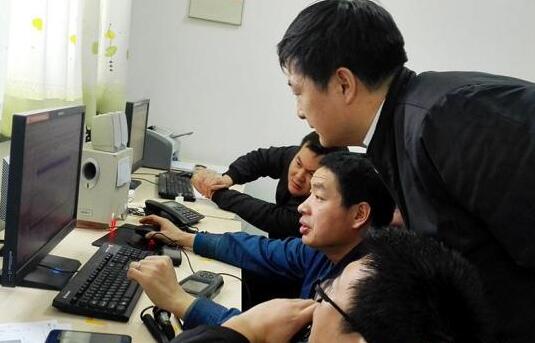 肖文剛(中間)在與同事交流設(shè)備振動分析