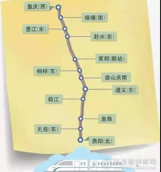 渝貴鐵路為客貨共線的國家一級雙線電氣化鐵路。全長345.4公里,設計時速為200公里/h,總投資約530億元。全線共設12座車站——從貴陽北站出發,自南向北依次經扎佐東、息烽、茍江、遵義東、婁山關南、桐梓東、夜郎鎮(這7站在貴州境內)、趕水東、綦江東、珞璜南(這3站在重慶境內)等10站,最后抵達重慶西站。