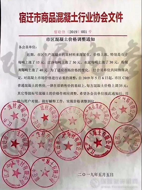 5月5日,宿遷市商品混凝土行業(yè)協(xié)會發(fā)布《市區(qū)混凝土價格調(diào)整通知》,宣布自5月6日起,C30普通混凝土售價每方上調(diào)35元。