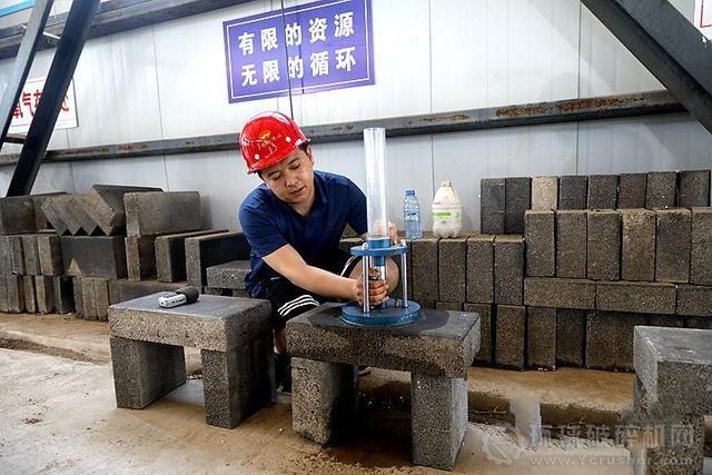 滹沱河建筑垃圾處置場(chǎng)制磚車間負(fù)責(zé)人潘琨為記者現(xiàn)場(chǎng)實(shí)驗(yàn)透水磚的透水性。