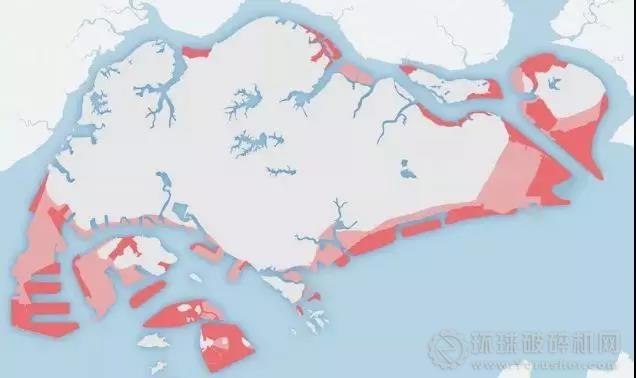 粉色區(qū)域表示到目前為止新加坡已經(jīng)開墾了多少土地。