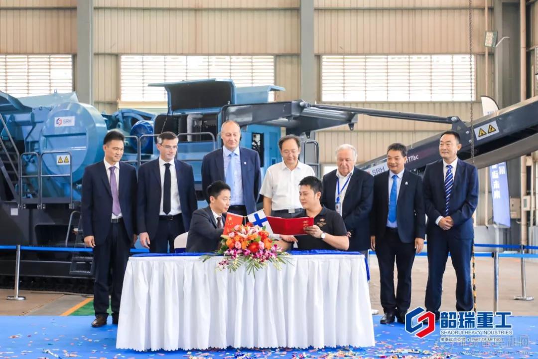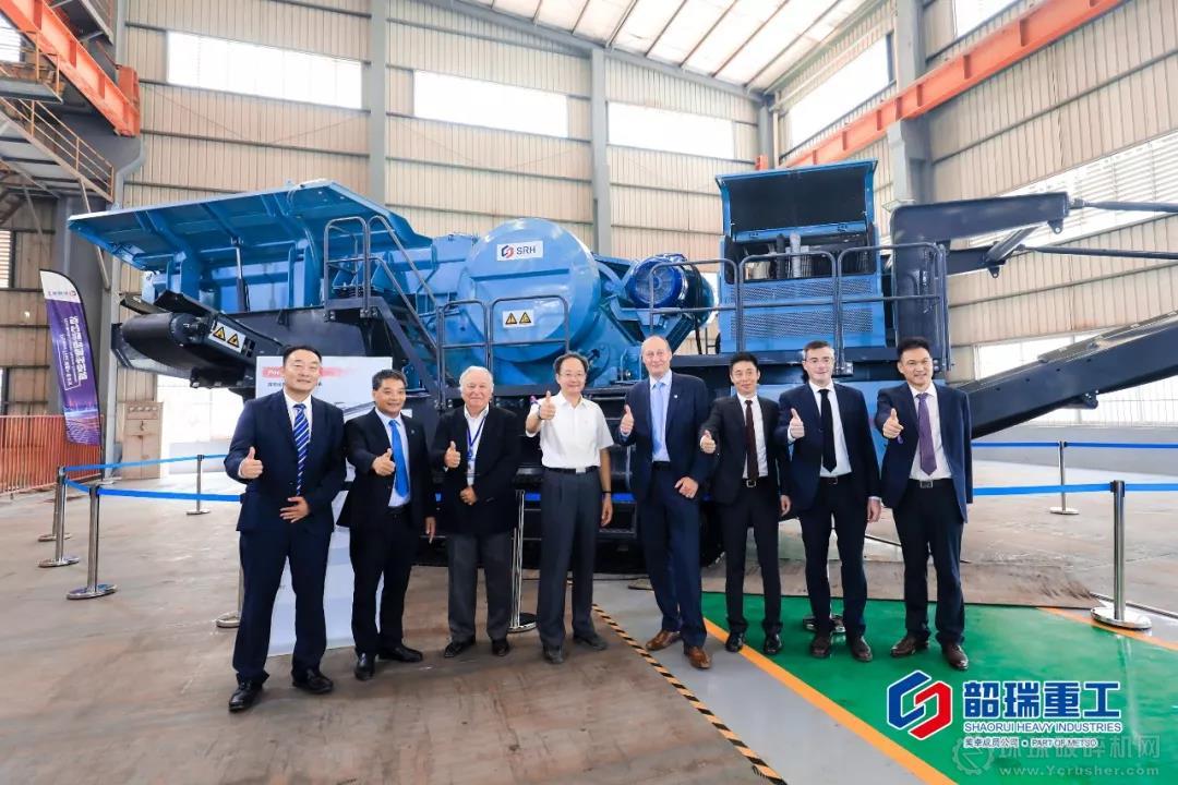 Mr.Markku Simula、Mr.Jack Marmet、梁曉峰先生、Mr. Federico Maurilli、殷煥明市長、伊凱先生、劉興先生、劉東先生共同為韶瑞重工首臺移動破碎篩分設(shè)備揭幕。