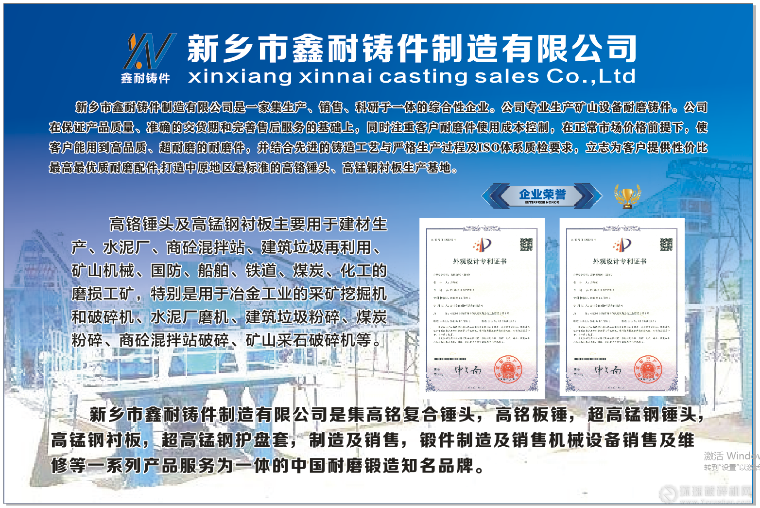 新鄉(xiāng)市鑫耐鑄件制造有限公司是一家集生產(chǎn)、銷售、科研于一體的綜合性企業(yè)。公司專業(yè)生產(chǎn)高鉻復(fù)合錘頭、高鉻板錘、高錳鋼