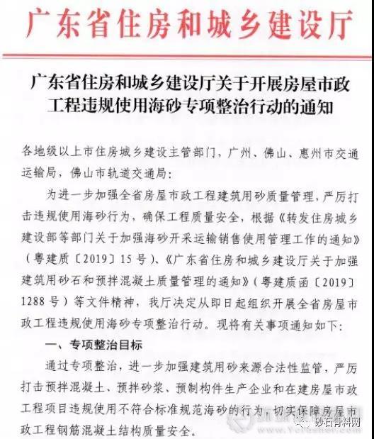 根據通知,廣東省住房與城鄉(xiāng)建設廳決定從即日起組織開展全省房屋市政工程違規(guī)使用海砂專項整治行動。