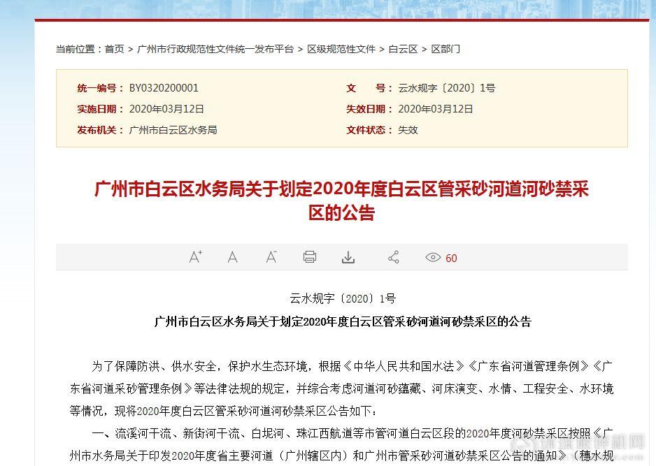 3月12日,廣州市白云區(qū)水務局發(fā)布關于劃定2020年度白云區(qū)管采砂河道河砂禁采區(qū)的公告,公告指出,白云區(qū)轄區(qū)內所有河道(河涌)劃定為2020年度河砂禁采區(qū)。