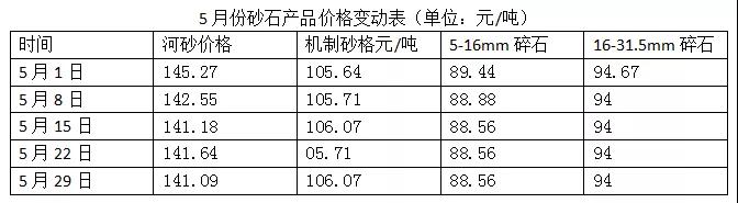 根據(jù)湖北省發(fā)改委數(shù)據(jù)顯示,湖北全省5月份砂石價(jià)格保持了前五個(gè)月低迷態(tài)勢(shì),砂石價(jià)格持續(xù)走低。截止5月29日,除機(jī)制砂外,湖北省砂石產(chǎn)品價(jià)格均有不同程度的下跌,其中河砂價(jià)格下跌明顯,5月份河砂價(jià)格下降超過(guò)4元/噸。