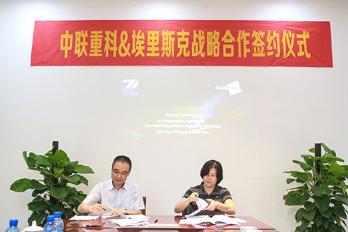 中聯(lián)重科股份有限公司礦山機(jī)械事業(yè)部負(fù)責(zé)人張海女士(右)與埃里斯克礦山工程機(jī)械有限公司董事長(zhǎng)馬昭淼先生(左)簽署戰(zhàn)略合作協(xié)議