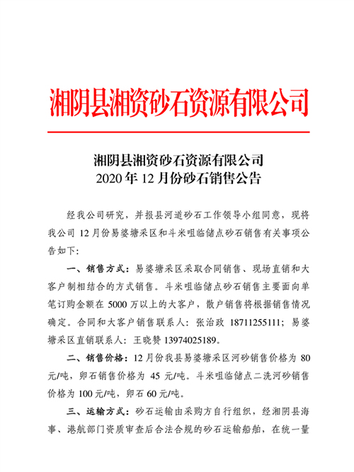 據悉,湘陰縣湘資砂石資源有限公司發布2020年12月份易婆塘采區和斗米咀臨儲點砂石銷售有關事項公告如下: