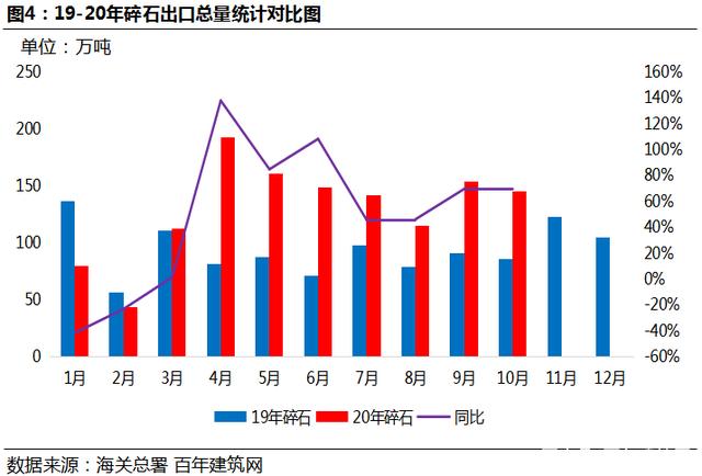 2019年天然砂出口總量約153.32萬噸,碎石出口量約1123.43萬噸,碎石出口較大。據(jù)海關(guān)數(shù)據(jù)顯示截至2020年10月底天然砂出口總量為202萬噸,同比增長65%;碎石進(jìn)口量約1293.86萬噸,同比上漲44.5%。