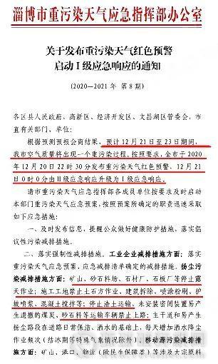 淄博市重污染天氣應(yīng)急指揮部辦公室發(fā)布《關(guān)于發(fā)布重污染天氣紅色預(yù)警啟動Ⅰ級應(yīng)急響應(yīng)的通知》(2020-2021 年 第8 期)稱,淄博全市于 2020年12月20日22時30分發(fā)布重污染天氣紅色預(yù)警,12月21日0時0分由Ⅱ級應(yīng)急響應(yīng)升級為工級應(yīng)急響應(yīng)。