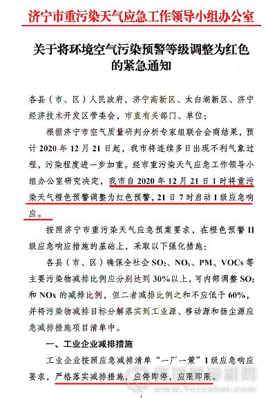 濟寧市重污染天氣應(yīng)急工作領(lǐng)導(dǎo)小組辦公室發(fā)布《關(guān)于將環(huán)境空氣污染預(yù)警等級調(diào)整為紅色的緊急通知》稱,自2020年12月21日1時將重污染天氣橙色預(yù)警調(diào)整為紅色預(yù)警,21日7時啟動I級應(yīng)急響應(yīng)。