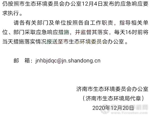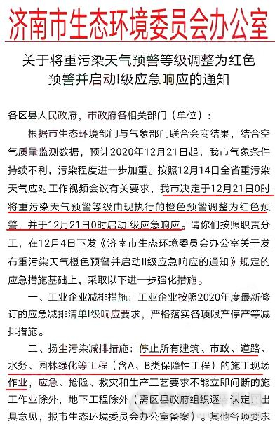 濟南市生態(tài)環(huán)境委員會辦公室通知自12月21日0時將重污染天氣預(yù)警等級由現(xiàn)執(zhí)行的橙色預(yù)警調(diào)整為紅色預(yù)警,并于12月21日0時啟動I級應(yīng)急響應(yīng)。工業(yè)企業(yè)按照2020年度最新修訂的應(yīng)急減排清單I級響應(yīng)要求,嚴格落實各項限產(chǎn)停產(chǎn)等減排措施。