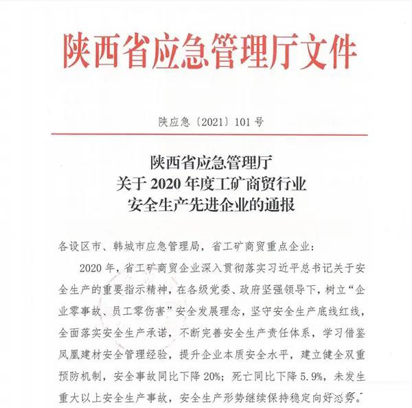3月2日,從陜西省應急管理廳獲悉,陜煤新材集團富平公司因安全生產基礎扎實、工作成績顯著,榮獲“2020年度工礦商貿行業安全生產先進企業”稱號。這是繼今年1月陜煤新材安全環保部獲集團“安全先進部門”榮譽稱號之后,公司在安全環保領域獲得的又一殊榮。